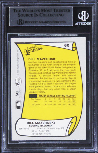 This Autographed 1988 Pacific Legends I #60 Card has been Personally Signed by Bill Mazeroski of the Pittsburg Pirates. This item is 100% Authentic, it comes slabbed and authenticated by Beckett Authentication Services. The authenticity can be verified on Beckett Authentication Services website.