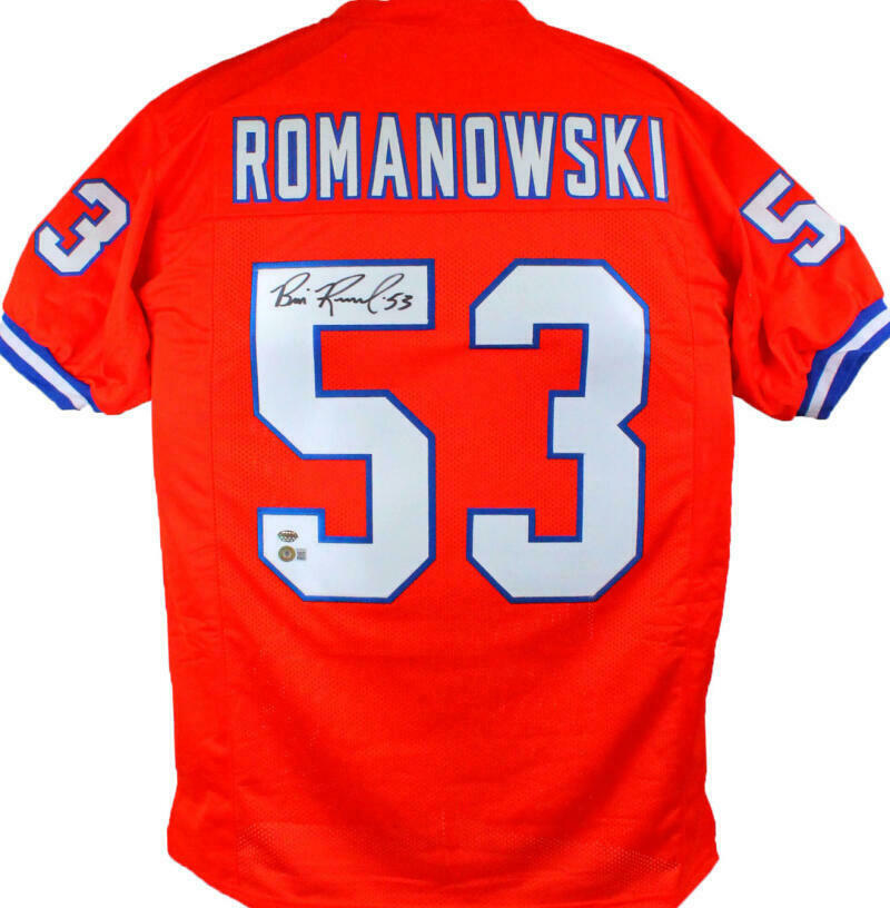 Bill Romanowski Autographed Pro Style Orange Jersey-Beckett Hologram *Black THIS IS NOT AN NFL JERSEY. THIS HAS NO TAGS, NO LOGOS, NO EMBLEMS. This is a Hand Autographed Pro Style Jersey Signed by Bill Romanowski. This is a Custom Made (Non Name Brand) Authentic Style (Stitched Letters and Numbers) Jersey. This item has a Beckett Authentication, which Comes with a Beckett #'ed hologram and a generic Beckett COA. You can view this item on the Beckett website. It was signed either at a public autograph appearance or a Private Signing. This is a stock photo of the item. Although you may not receive this exact item, the item you receive is virtually identical and brand new in great shape. Jersey size is XL.