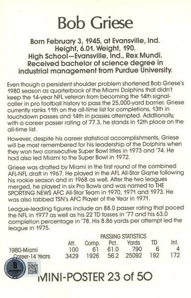 The number in the listing title is just an inventory sku for our records and is not the authentication number. This is the exact item that you will receive so please see pictures for condition. This is a mini poster measuring 8.5" x 5.5" that was personally autographed by Bob Griese with HOF inscription. Includes a certificate of authenticity from Beckett Authentication Services (BAS) and Denver Autographs.FREE SHIPPING within the USA on orders over $10!