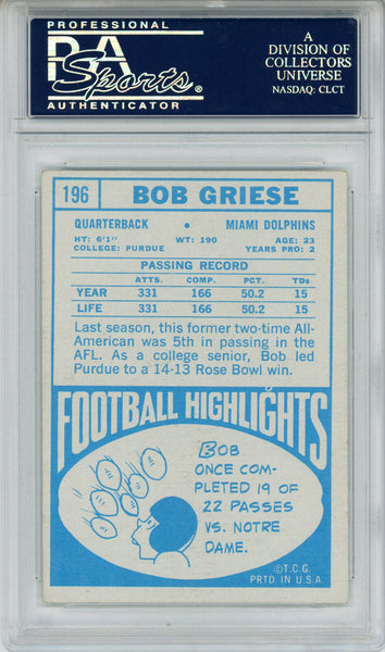 Bob Griese Autographed/Signed 1968 Topps #196 Trading Card PSA Slab 43735 The number in the listing title is just an inventory sku for our records and is not the authentication number. This is the exact item that you will receive so please see pictures for condition. This is a trading card that was personally autographed by Bob Griese. This has been professionally slabbed by Professional Authentication Services (PSA) and includes a certificate of authenticity from Denver Autographs.