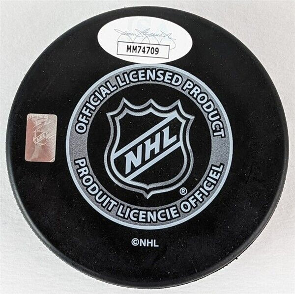 This autographed hockey puck has been personally hand-signed by Bobby Hull of the Chicago Blackhawks. Hull added the inscription "61 Cup Champions" along with his signature. This autograph is certified by James Spence Authentication (JSA). It comes with the numbered hologram and matching Certificate of Authenticity.