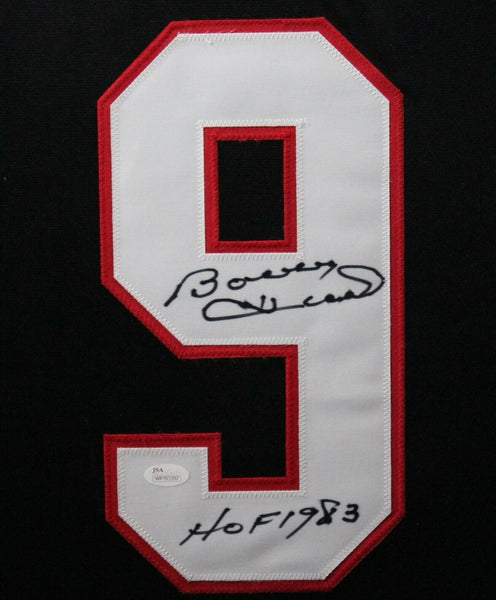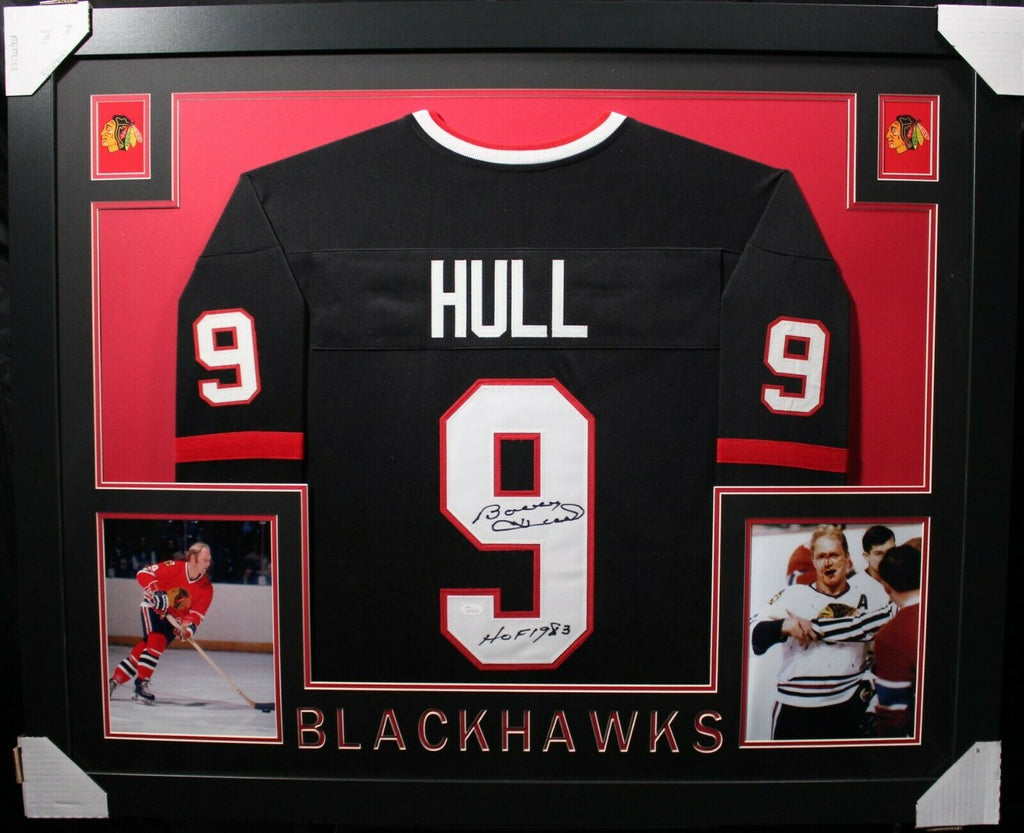 BOBBY HULL AUTOGRAPHED & PROFESSIONALLY FRAMED PRO-STYLE JERSEY(Occasionally our own stock pictures are used at times due to quantity of framing, all frames will look identical as the one pictured)THE FRAMED JERSEY MEASURES 35"x 44" & COMES WITH THE FOLLOWING:-UV Protected Acrylic-Triple Acid Free Team Colored Matting-2 High Quality 8"x10" Photos-Team LogoEvery framed autographed jersey is accompanied with a tamper-proof hologram on the signed part of the jersey from one of the main authenticators in the industry (JSA, Beckett, PSA, etc.) and can be verified on their corresponding websites to prove authenticity.ATTENTION:If there's any damage during shipping then please message us immediately and save the box!DO NOT OPEN A RETURN OR DISPUTE PLEASE!We will provide a return label to send the frame back so we can fix any issues right away and ship it right back to you, free of charge of course!WE DO NOT OFFER PARTIAL REFUNDS TO FIX LOCALLY AS EVERYTHING IS FRAMED/FIXED IN HOUSE- Thank you -