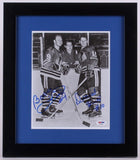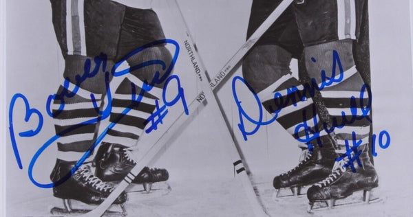Custom framed photo measures 13" x 15" in size and has been hand-signed in blue felt-tip pen by Bobby Hull (HOF) and Dennis Hull. The autograph includes an official PSA/DNA hologram and matching COA for authenticity purposes.Authentication: PSA COA