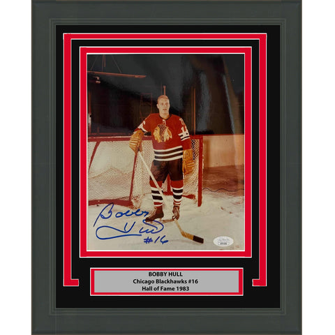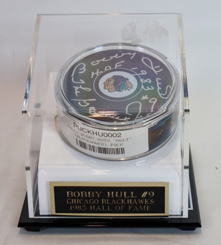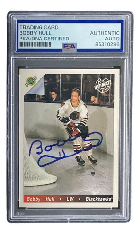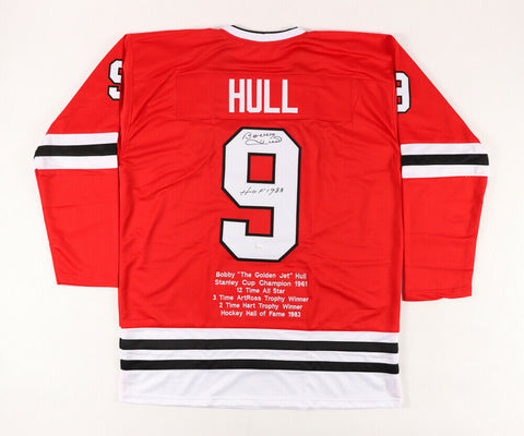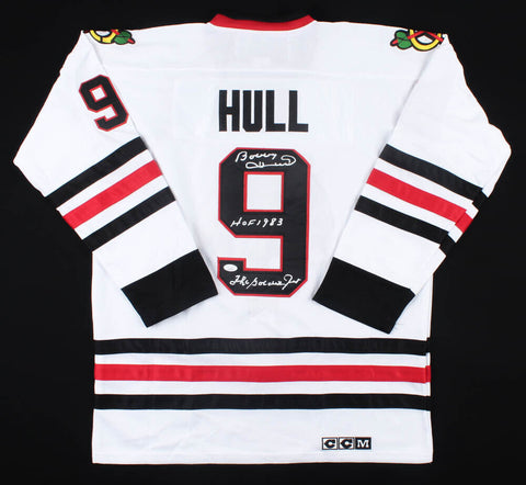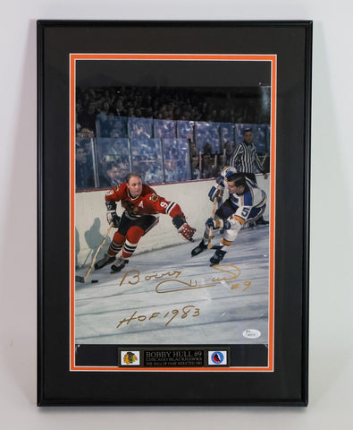 Bobby Hull signed Chicago Blackhawks horizontal action 8x10 photo with 'HOF 1983' inscription. Item comes with a Schwartz Sports Memorabilia tamper-proof numbered hologram and Certificate of Authenticity which can be verified online.