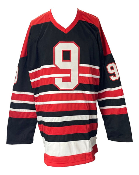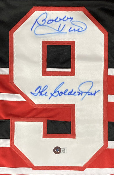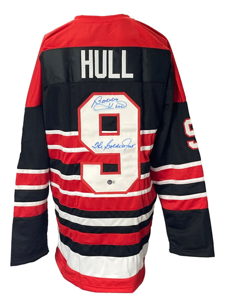 Featured is a Bobby Hull signed custom hockey jersey, inscribed "The Golden Jet". This jersey has been hand signed by Hull and comes with the Beckett hologram and certificate of authenticity. This jersey features professionally sewn letters and numbers and is size XL. This jersey has no team tags or emblems and is intended as a sports collectible. This jersey would make a great addition to any sports memorabilia collection! SPECIFICATIONS Autographed By: Bobby Hull Team: Chicago Blackhawks Sport: Hockey Authentication: Beckett Grading Services