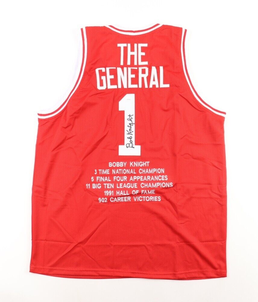 Custom on-court style jersey. Everything is sewn on, size XL. Has been hand-signed by Bobby Knight (HOF). Knight's career highlights have been custom stitched onto the back of the jersey below the reverse numbers.Nicknamed "The General," Bobby Knight won 902 NCAA Division I men's college basketball games, most all-time at the time of his retirement and currently third all-time behind his former player, Mike Krzyzewski of Duke and Jim Boeheim of Syracuse. He is best known as the head coach of the Indiana Hoosiers from 1971-2000.While at Indiana, Knight led his teams to three NCAA championships, one National Invitation Tournament (NIT) championship, and 11 Big Ten Conference championships. He received the National Coach of the Year honor four times and the Big Ten Coach of the Year honor eight times. In 1984, he coached the USA men's Olympic team to a gold medal, becoming one of only three basketball coaches to win an NCAA title, NIT title, and an Olympic gold medal.The lot / autograph(s) includes an official James Spence Authentication (JSA) hologram and matching COA for authenticity purposes. The signing of this item was witnessed by JSA.Authentication: JSA COA