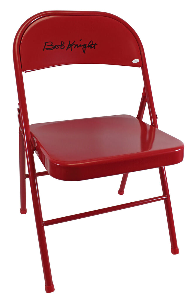 This Autographed Red Folding Chair has been Personally Signed by Bobby Knight of the Indiana Hoosiers. This item is 100% Authentic to include a hologram by Beckett Authentication Services. This item will come with an affixed Beckett Authentication Services (BAS) authentication sticker, which includes a scannable QR code to verify authenticity. Please note that Beckett no longer provides serial-numbered COA cards, and the attached BAS sticker will serve as the complete authentication for this item. This is a BAS Witnessed Protection Program item which means a Beckett Authentication Service representative was present when this item was being signed. We have multiples of this same item. While the photographs are representative of this item, the size, placement and strength of the signature may vary. Each item is hand signed, therefore, each autograph is unique.This item can be verified through Beckett.