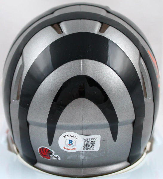 Boomer Esiason Autographed Cincinnati Bengals Flash Speed Mini Helmet-Beckett W Hologram *ORANGE This is a Hand Autographed Mini Helmet of Boomer Esiason of The Cincinnati Bengals. This is a Riddell Football Flash Speed Mini Helmet. This item has a Beckett Witnessed Authentication, which Comes with a Beckett #'ed hologram and a QR code for verification. You can view this item on the Beckett website and it shows when and where the item was signed. It was signed either at a public autograph appearance or a Private Signing. This is a stock photo of the item. Although you may not receive this exact item, the item you receive is virtually identical and brand new in great shape.
