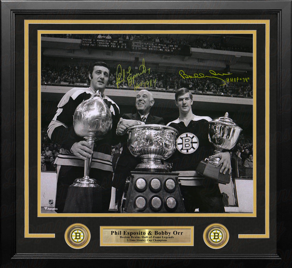 Bobby Orr & Phil Esposito Boston Bruins Autographed 16" x 20" Framed Hockey Photo Fanatics Signed picture of Bruins legends Phil Esposito and Bobby Orr; authenticated by FanaticsThis photo has been hand-signed by Bruins hockey legends Phil Esposito and Bobby Orr. It has been authenticated by Fanatics with a serially numbered hologram.Hand-Signed by Boston Bruins legends Phil Esposito and Bobby OrrSignatures are bold clear on the photoAuthenticated with Fanatics serially numbered hologramFramed and matted photos are professional qualityFramed 16" x 20" photo comes in 22" x 26" frame