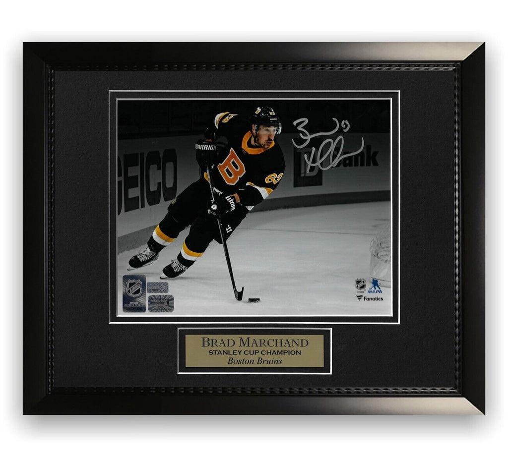 This 8x10 photo custom framed to 11x14 has been personally hand signed by Brad Marchand of the Boston Bruins100% Authentic Ready to hang on the wallCertificate of Authenticity by New England Picture and has his official player hologram Exact location of signature may vary