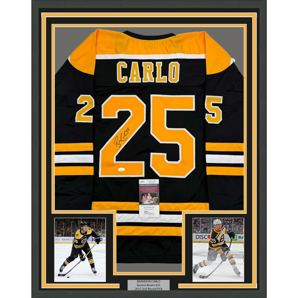 Framed Autographed/Signed Brandon Carlo 35x39 Boston Black Hockey Jersey JSA COA The item is professionally framed and matted with two 5x7 photos, measures 35x39 inches and is ready to be hung in your man cave! Photo and matting requests can be made.