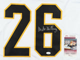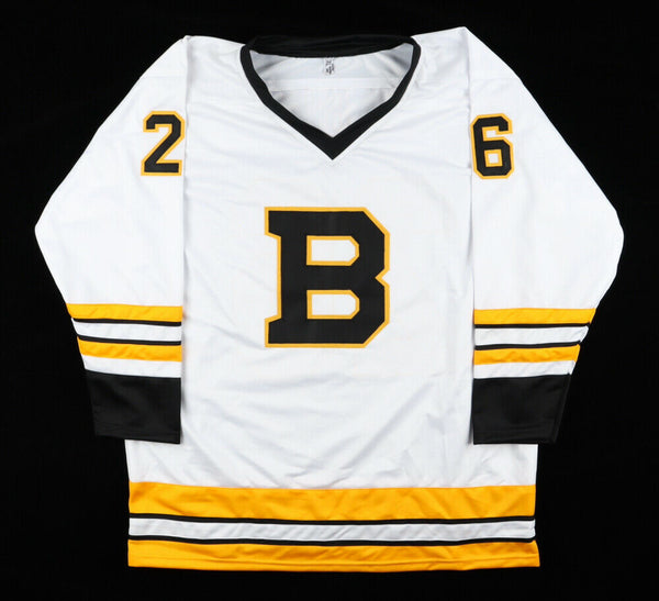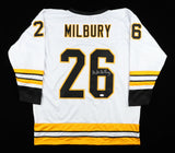 Custom on-ice style jersey. Everything sewn on, size XL. Hand-signed in silver felt-tip pen by Mike Milbury. The autograph includes an official James Spence Authentication (JSA) hologram and matching COA for authenticity purposes. The signing of this item was witnessed by JSA.Authentication: JSA COA