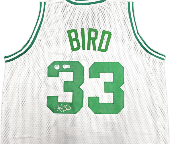 This is a White Jersey that has been hand signed by Larry Bird. This is a custom jersey with no name brand. The approximate size is XL. It has nice sewn in name and numbers. This item has been witnessed and certified authentic by Beckett Authentication (BAS) and comes with their tamper-proof witness hologram.