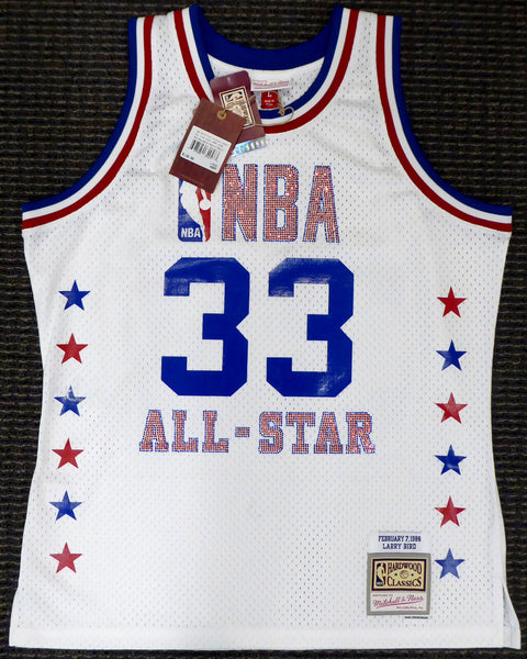 This is a White Mitchell & Ness Boston Celtics 1988 All Star Game Rhinestone Swingman Jersey that has been hand signed by Larry Bird. This jersey is Size L. There is a smudge in the signature as shown. This item has been certified authentic by Beckett Authentication (BAS) and comes with their tamper-proof sticker and matching certificate of authenticity.