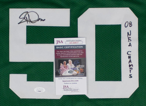 This autographed custom on court style adult XL jersey has been personally hand-signed by Eddie House of the Boston Celtics. When signing, House inscribed "08 NBA Champs" along with his signature.This autograph is certified by James Spence Authentication (JSA). It comes with the numbered hologram and matching Certificate of Authenticity.Custom on-court style jerseys are a more affordable option for autograph seekers. These jerseys do not have any brand name or tags and are made in the Philippines. They feature stitched on names and numbers and are made to look very similar to the on-field jerseys that the players wear. These custom jerseys are very commonly used in the memorabilia industry.