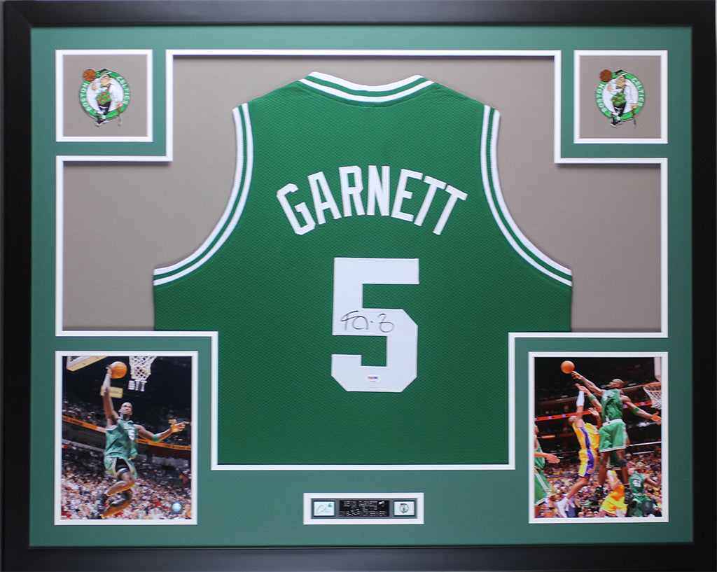 This framed jersey has been personally hand-signed by Kevin Garnett. Item is accompanied by a Certificate of Authenticity issued by PSA and a corresponding tamper-proof hologram or sticker on the jersey. To ensure authenticity, the hologram or COA can be reviewed online. This process helps to ensure that the product purchased is authentic and eliminates any possibility of duplication or fraud. It measures 35" x 43" and comes ready to hang in your home or office.