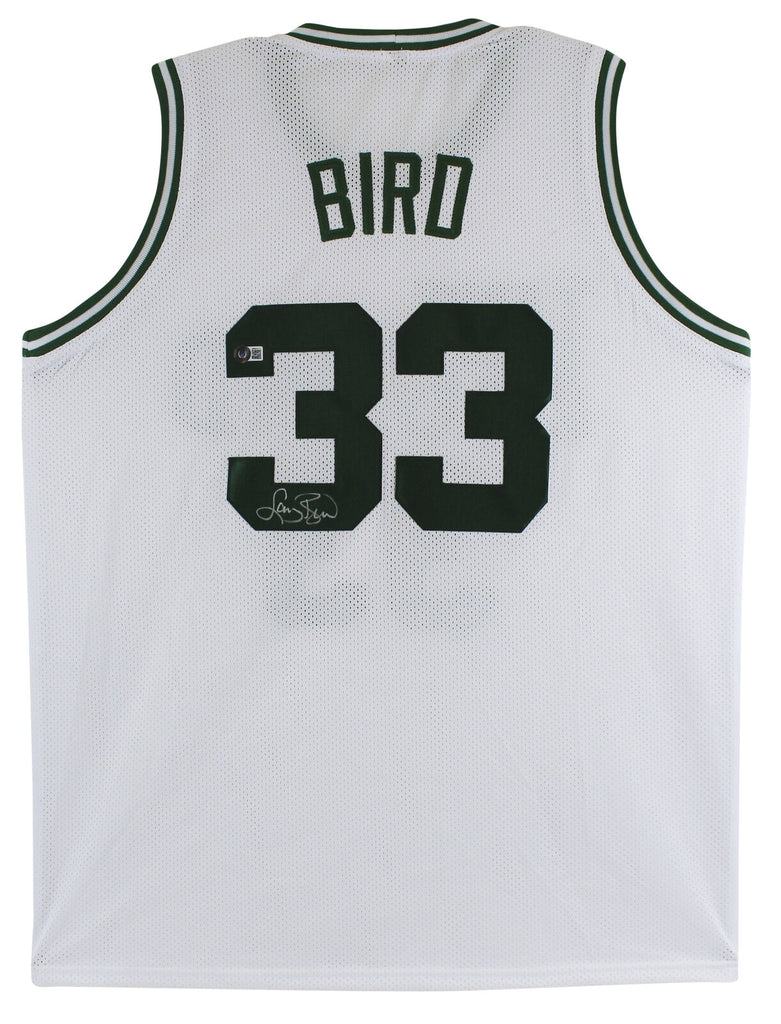 This Autographed White Pro Style Jersey has been Personally Signed by Larry Bird of the Boston Celtics. This item is 100% Authentic to include a Certificate of Authenticity (COA) / hologram by Beckett Authentication Services. This is a stock item. We conducted an autograph signing with Larry Bird and we have several of these available. The one you will receive will be of equal quality to the one pictured. This item can be verified through BAS. This is a X-Large sized, non-branded, custom-stitched Jersey. The proof signing photo will not come with the item.