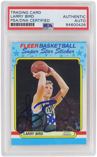 Larry Bird signed Boston Celtics 1988 Fleer sticker basketball trading card #2. The card has been authenticated and encapsulated by PSA/DNA and the number can be verified online. The image of the item is a stock photo, as we may have multiples of the item in stock. The Slabbed Card you will receive will be of the card described. (Same grade, Same authentication) You may or may not receive the exact PSA serial number on the slab label shown in image.