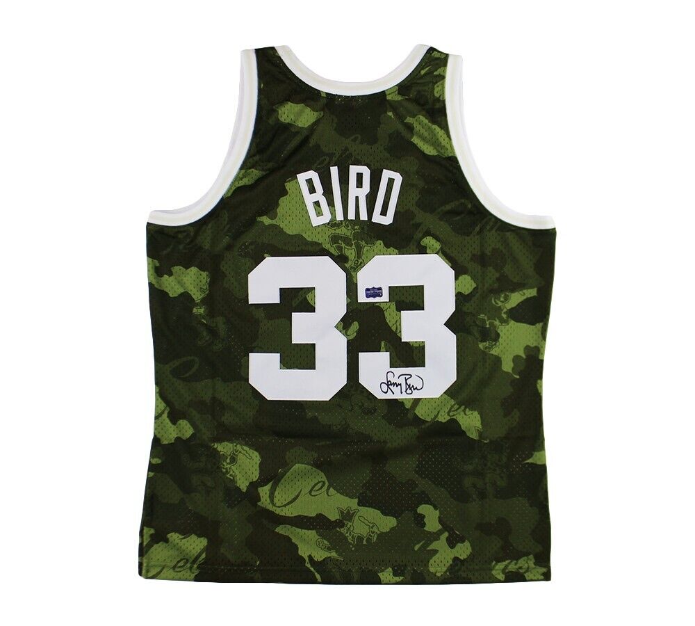 A Boston Celtics Mitchell & Ness Swingman Camo Ghost Green NBA Jersey hand signed by Larry Bird. The item and signature are in excellent condition. Larry was drafted into the NBA by the Boston Celtics in 1978. He is a 3x NBA Champion, 2x NBA Finals MVP, 3x NBM MVP and 12x NBA All-Star. AUTHENTICATION: The item has been tagged with a SmarTag powered by Prova Technology, which gives you digital access to the items authentication records, including a proof picture from the signing.
