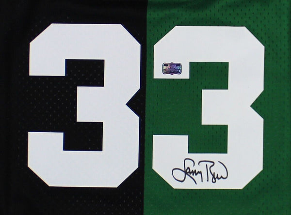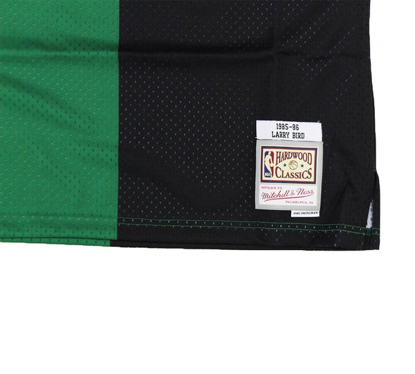 A Boston Celtics Mitchell & Ness Swingman Split Black and Green NBA Jersey hand signed by Larry Bird. The item and signature are in excellent condition. Larry was drafted into the NBA by the Boston Celtics in 1978. He is a 3x NBA Champion, 2x NBA Finals MVP, 3x NBM MVP and 12x NBA All-Star. AUTHENTICATION: The item has been tagged with a SmarTag powered by Prova Technology, which gives you digital access to the items authentication records, including a proof picture from the signing.