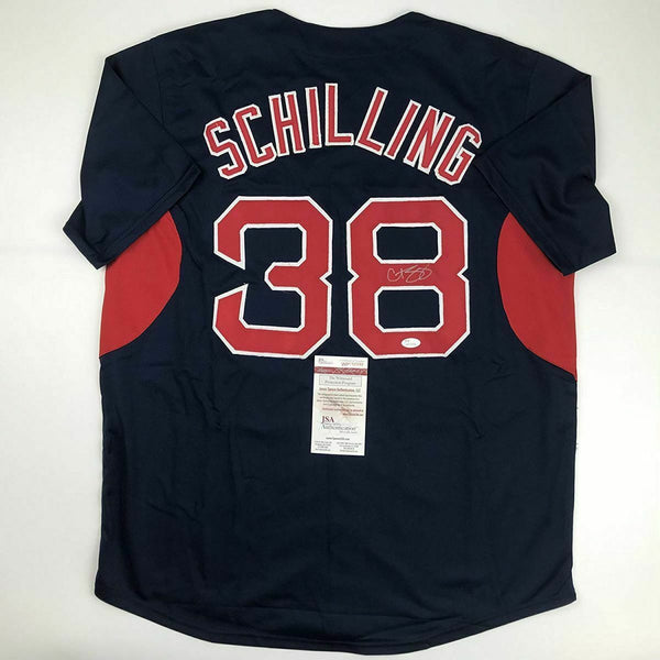 Autographed/Signed CURT SCHILLING Boston Blue Baseball Jersey JSA COA Auto This is a custom jersey and was not manufactured by or in any manner associated with any professional sports league or manufacturer. This custom jersey carries no professional sports league designation. The item is intended to be an autographed collectible. Reference of team in the title is to allow the purchaser a point of association. The custom jersey displays the name, number and authenticated signature of the player. This item in no way is affiliated with or connected to any professional sports organization. The autograph, as always is guaranteed to be authentic and has been certified as authentic by a third-party, trusted authenticator. Size is XL unless otherwise noted.