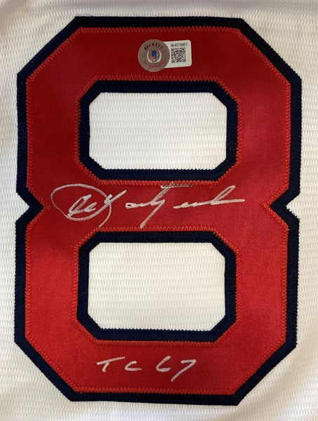Featured is a Carl Yastzemski signed Boston Red Sox Majestic replica baseball jersey, inscribed "TC 67". This jersey has been hand signed by Yastrzemski and comes with the Beckett hologram and certificate of authenticity. Jersey size may vary. This jersey would make a great addition to any sports memorabilia collection!. SPECIFICATIONS Autographed By: Carl Yastrzemski Team: Boston Red Sox Sport: Baseball Authentication: Beckett Grading Services