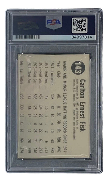 Featured is a Carlton Fisk Boston Red Sox signed 1975 Hostess #143 trading card. This card has been hand signed by Fisk and has been authenticated and encapsulated by PSA. This card would make a great addition to any sports memorabilia collection!. SPECIFICATIONS Autographed By: Carlton Fisk Team: Sport: Baseball Authentication: Professional Sports Authenticator (PSA)