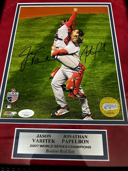 This photo framed to 14x17 has been personally hand-signed by Jonathan Papelbon & Jason Varitek of the Boston Red Sox. 100% AuthenticCertificate of Authenticity by JSA
