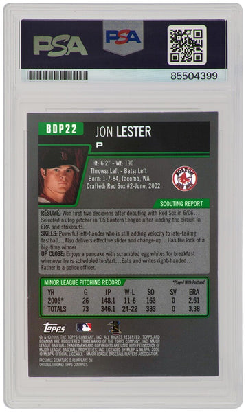 Jon Lester signed Boston Red Sox 2006 Bowman Draft gold rookie baseball trading card #BDP22. The card has been authenticated and encapsulated by PSA/DNA and the number can be verified online.