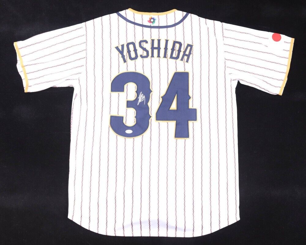 Custom on field style Team Japan jersey. Everything is sewn on, size XL. Hand-signed by Masataka Yoshida (Orix Buffaloes, Boston Red Sox).The autograph(s) includes an official James Spence Authentication (JSA) hologram and matching COA for authenticity purposes.Authentication: JSA COA