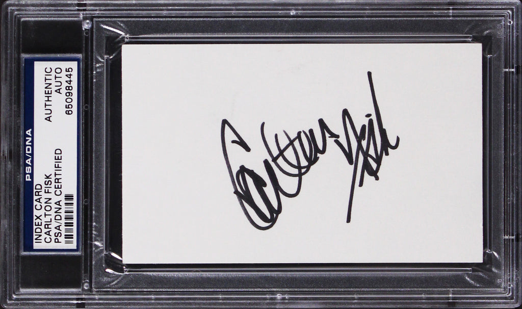 This Autographed 3x5 Index Card has been Personally Signed by Carlton Fisk of the Boston Red Sox. This item is 100% Authentic, it comes slabbed and authenticated by PSA/DNA. The authenticity can be verified on Professional Sports Authenticator website.