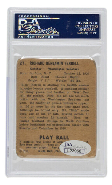 Rick Ferrell Signed 1940 Play Ball Baseball Card #21 Detroit Tigers Insc PSA/DNA