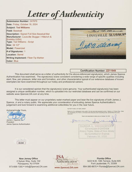 Featured is a Ted Williams signed Louisville Slugger baseball bat. This bat has been hand signed by Williams and comes with the JSA hologram and letter of authenticity. This bat would make a great addition to any sports memorabilia collection!. SPECIFICATIONS Autographed By: Team: Boston Red Sox Sport: Baseball Authentication: James Spence Authentication (JSA)