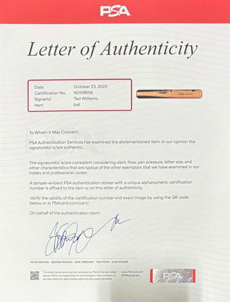 Featured is a Ted Williams signed Louisville Slugger baseball bat. This bat has been hand signed by Williams and comes with the PSA/DNA hologram and letter of authenticity. This bat would make a great addition to any sports memorabilia collection!. SPECIFICATIONS Autographed By: Team: Boston Red Sox Sport: Baseball Authentication: PSA/DNA Authentication Services