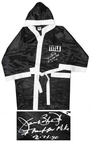 James Buster Douglas signed Everlast black boxing robe with 'I Beat Iron Mike KO 2-11-90' inscription, which is the date at the Tokyo Dome where his historic upset over Mike Tyson occurred. Item comes with a Schwartz Sports Memorabilia tamper-proof numbered hologram and Certificate of Authenticity which can be verified online.