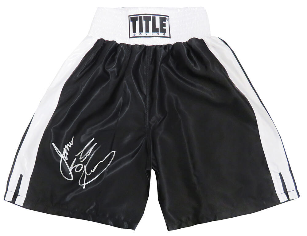 James Toney signed Title black with white trim boxing trunks with 'Lights Out' inscription. Item comes with a Schwartz Sports Memorabilia tamper-proof numbered hologram and Certificate of Authenticity which can be verified online.