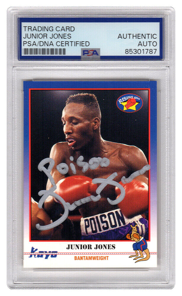 Junior Jones signed 1991 Kayo boxing trading card #231 with 'Poison' inscription. The card has been authenticated and encapsulated by PSA and the authentication number can be verified online.