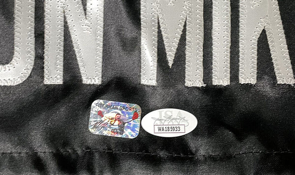 Featured is a Mike Tyson signed pair of custom black boxing trunks. These trunks were hand signed by Mike Tyson in the presence of a JSA authentication representative. Included with these trunks are a JSA witnessed hologram and certificate of authenticity. This item would be a great addition to any sports memorabilia collection.. SPECIFICATIONS Autographed By: Mike Tyson Team: Sport: Boxing Authentication: James Spence Authentication (JSA)