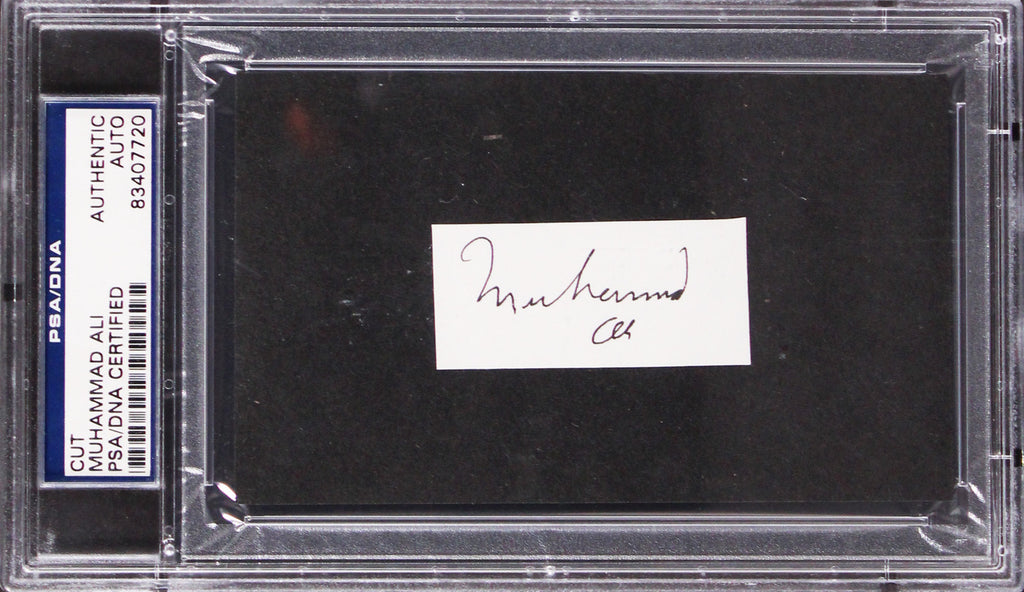 This Autographed 1x2.25 Cut Signature has been Personally Signed by Muhammad Ali. This item is 100% Authentic, it comes slabbed and authenticated by PSA/DNA. The authenticity can be verified on Professional Sports Authenticator website.