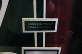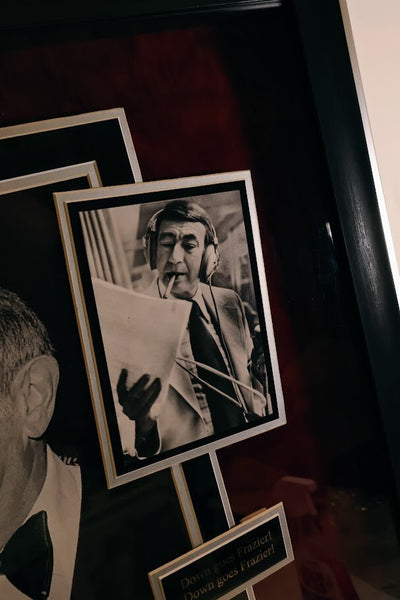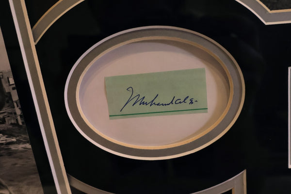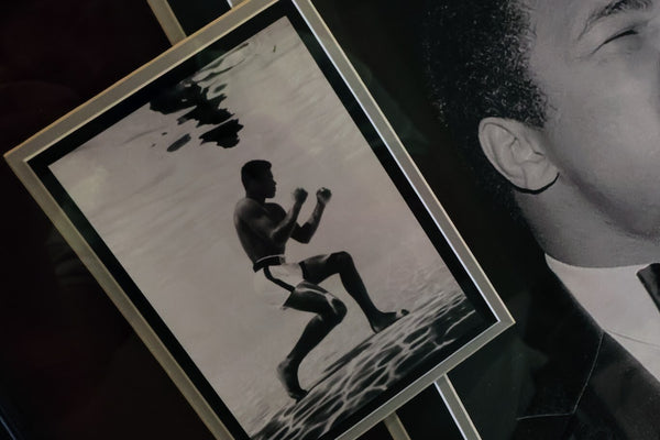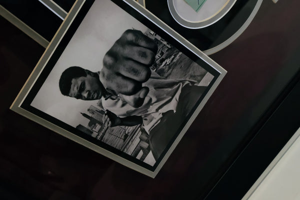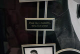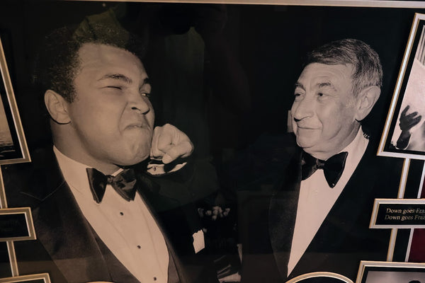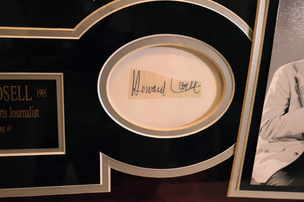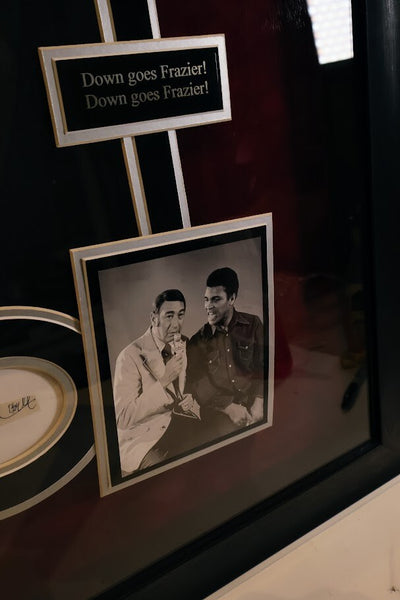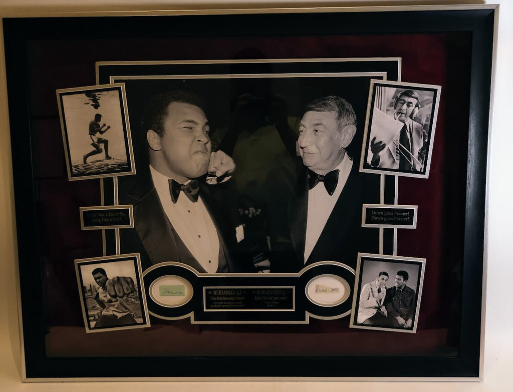 For sale is a rare and beautifully framed dual-autographed collage featuring boxing legend Muhammad Ali and iconic sportscaster Howard Cosell. This visually striking piece captures the unforgettable relationship between two of the most influential figures in sports history. This collectible includes: Authentic signatures of both Muhammad Ali and Howard Cosell, each displayed beneath their image Stunning oversized collage layout with five classic black & white images, including: Ali training underwater Cosell broadcasting ringside The two men laughing during an interview Iconic fist pose Their tuxedoed face-off moment JSA LOA (Letter of Authenticity) included -- one of the most trusted names in memorabilia authentication Famous quotes included: "Float like a butterfly, sting like a bee" "Down goes Frazier! Down goes Frazier!" This is a museum-quality collector's piece, ideal for display in a home office, sports room, or gallery.