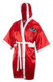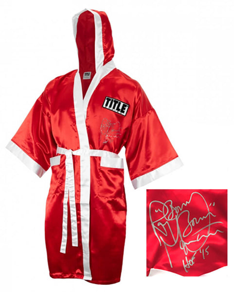Ray Mancini signed Title red and white boxing robe with 'Boom Boom' and 'HOF 15' inscriptions. Item comes with a Schwartz Sports Memorabilia tamper-proof numbered hologram and Certificate of Authenticity which can be verified online.