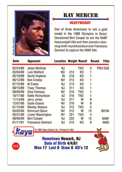 Ray Mercer Autographed 1991 Kayo Boxing Trading Card #117 - SS COA