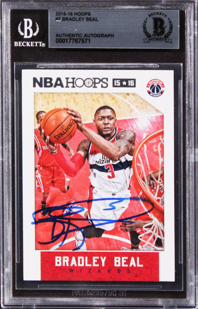 This Autographed 2015 Hoops #7 Card has been Personally Signed by Bradley Beal of the Washington Wizards. This item is 100% Authentic, it comes slabbed and authenticated by Beckett Authentication Services. The authenticity can be verified on Beckett Authentication Services website.