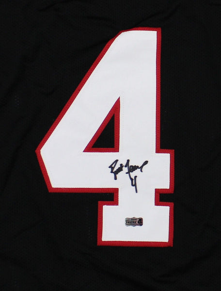An Atlanta Custom Black Jersey hand signed by Brett Favre. The item and signature are in excellent condition. Brett is a Super Bowl Champion, 11x Pro Bowler, 3x AP NFL Most Valuable Player, 4x NFL passing touchdowns leader, and 2x passing yards leader. His number, 4, has been retired by both the Green Bay Packers and the Southern Miss Golden Eagles. Brett was inducted into the Pro Football Hall of Fame in 2016. AUTHENTICATION: Your item has been tagged with a Brett Favre Exclusive SmarTag powered by Prova Technology, which gives you digital access to your items authentication records, including a proof picture from the signing.