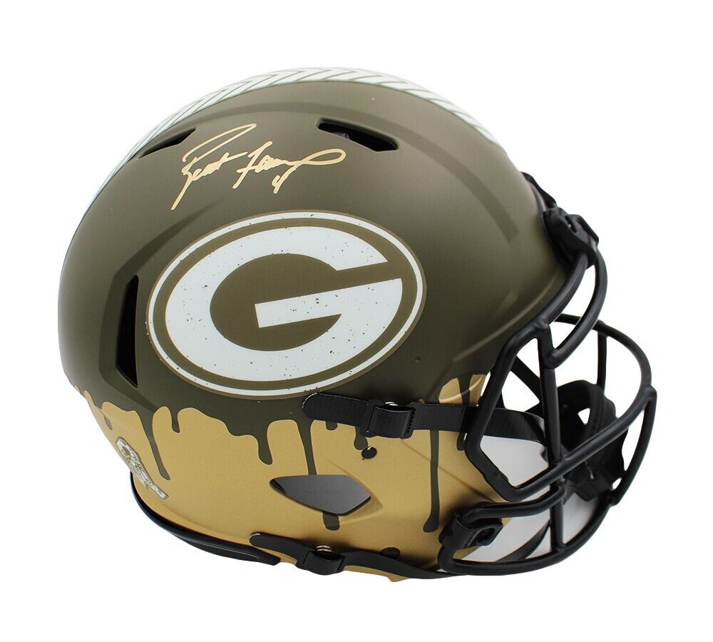 A Green Bay Packers Speed Authentic Custom Salute to Service NFL Helmet hand signed by Brett Favre. The item and signature are in excellent condition. Brett is one of the most iconic players in NFL history. A 20 year veteran of the NFL, Brett is a Super Bowl Champion, 11x Pro Bowler, 3x AP NFL Most Valuable Player, 4x NFL passing touchdowns leader, and 2x passing yards leader. His number, 4, has been retired by both the Green Bay Packers and the Southern Miss Golden Eagles. Brett was inducted into the Pro Football Hall of Fame in 2016. AUTHENTICATION: Your item has been tagged with a Brett Favre Exclusive SmarTag powered by Prova Technology, which gives you digital access to your items authentication records, including a proof picture from the signing.