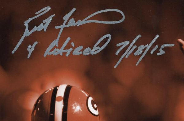 A Green Bay Packers Unframed 8x10 NFL Photo hand signed by Brett Favre. The item and signature are in excellent condition. In addition to signing his name, Brett also inscribed "4 Retired 7/18/15" on the item. This is a Limited Edition of 44. Brett is one of the most iconic players in NFL history. A 20 year veteran of the NFL, Brett is a Super Bowl Champion, 11x Pro Bowler, 3x AP NFL Most Valuable Player, 4x NFL passing touchdowns leader, and 2x passing yards leader. His number, 4, has been retired by both the Green Bay Packers and the Southern Miss Golden Eagles. Brett was inducted into the Pro Football Hall of Fame in 2016. AUTHENTICATION: The item is accompanied by a Brett Favre Exclusive Certificate of Authenticity - Brett Favre Sqor Sports/ Exclusive Serial Numbered & Databased Hologram - Picture of Brett from the signing
