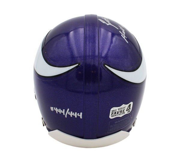 A Minnesota Vikings NFL Mini Helmet hand signed by Brett Favre. The item and signature are in excellent condition. In addition to signing his name, Brett also inscribed "Hall of Fame 2016" on the item. The item is a limited edition 44 of 444. Buyer will receive a #444 from the edition. Brett is a Super Bowl Champion, 11x Pro Bowler, and is a member of the NFL Hall of Fame. AUTHENTICATION: The item is accompanied by a /SQOR Sports Certificate of Authenticity - /SQOR Sports Serial Numbered and Databased Hologram - Picture of Brett from the signing.