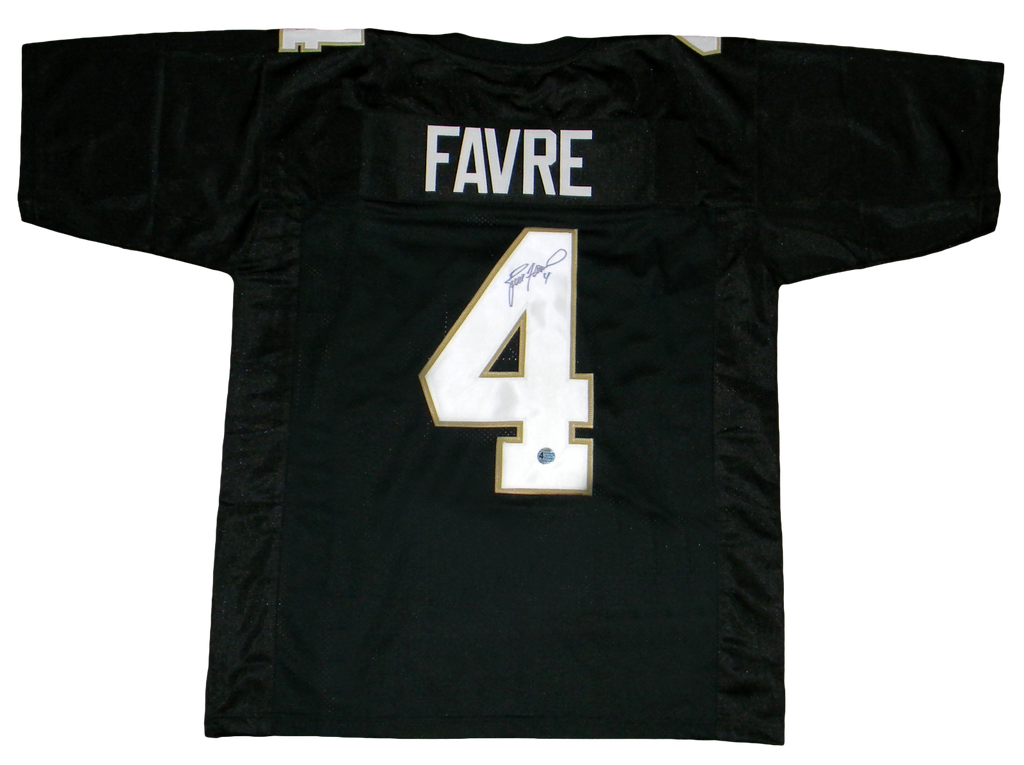 Brett Favre, former star quarterback for the Southern Miss Golden Eagles, has hand signed this black custom jersey at a private signing. Jersey is size XL and all letters/numbers are sewn-on. This item comes with a certificate of authenticity (COA) from Favre's personal company so you know it's authentic! You will receive a paper COA along with a photo from the signing. There are matching serial-numbered holograms on the COA, jersey and photo.Item pictured may not be the exact item you will receive. It will be similar quality, and we guarantee your satisfaction.