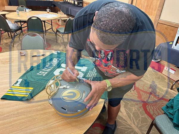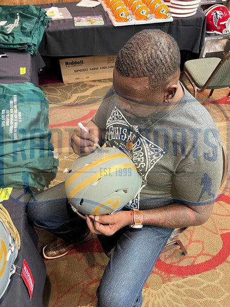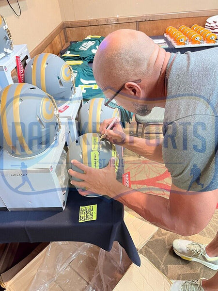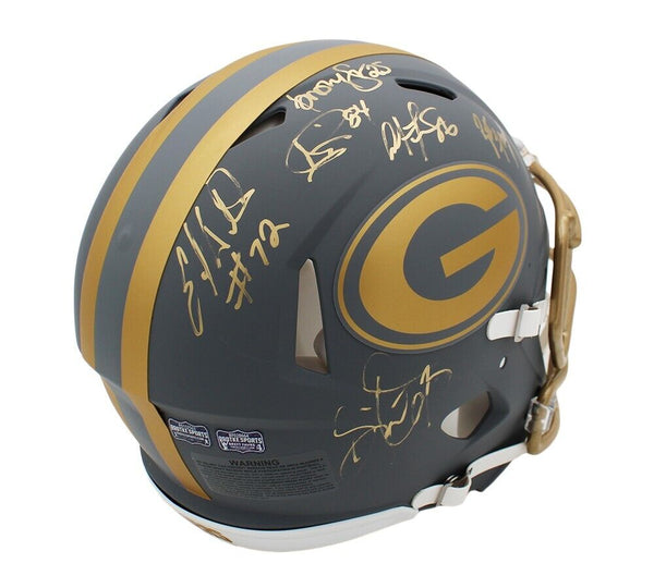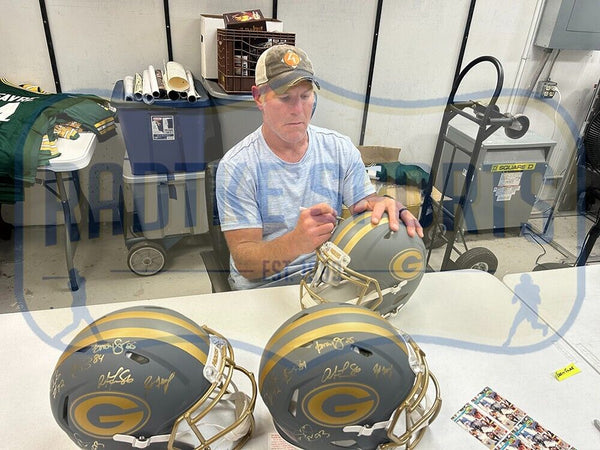 A Green Bay Packers Speed Authentic Slate NFL Helmet hand signed by Brett Favre, Andre Rison, Gilbert Brown, Dorsey Levens, Earl Dotson & Antonio Freeman. The item and signature are in excellent condition. AUTHENTICATION: Your item has been tagged with a SmarTag powered by Prova Technology, which gives you digital access to your items authentication records, including a proof picture from the signing.