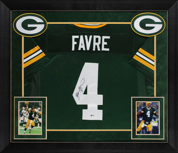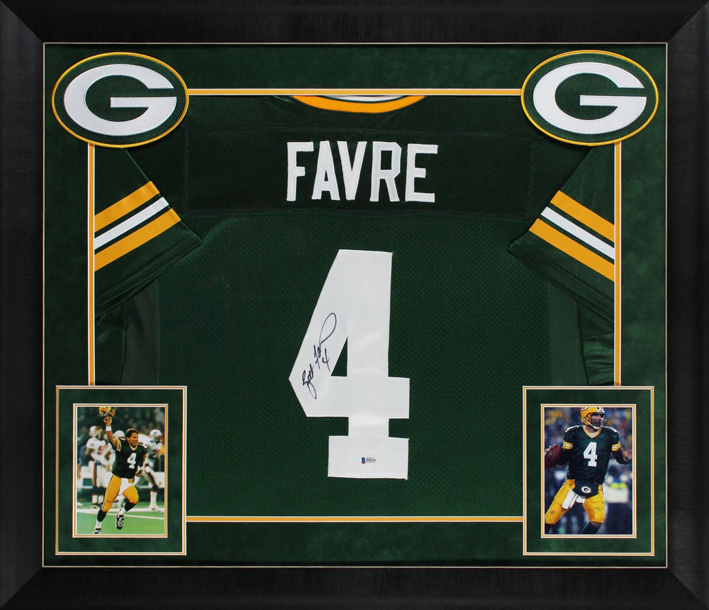 This Autographed Green Authentic Wilson Size 48 Framed Jersey has been Personally Signed by Brett Favre of the Green Bay Packers. This item is 100% Authentic to include a Certificate of Authenticity (COA) / hologram by Beckett Authentication Services. The authenticity can be verified on Beckett Authentication Services website. This item has been professionally framed to overall dimensions of approximately 32 x 37 inches. This is a X-Large sized Framed Jersey.